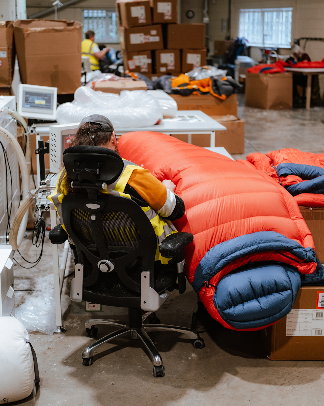 Even the brand's approach to sustainability felt grounded and real. Yes, there were still huge bales of plastic – like any modern company – but it wasn’t hidden away or glossed over. Instead, Matt & Paul explained how it’s collected, repurposed into packing pellets, and given another life. At the opposite end of the factory, another set of bales – this time offcuts from old sleeping bags and jackets sent in by customers sat waiting to have their down recycled and reused. Everything in the facility has a second purpose.
